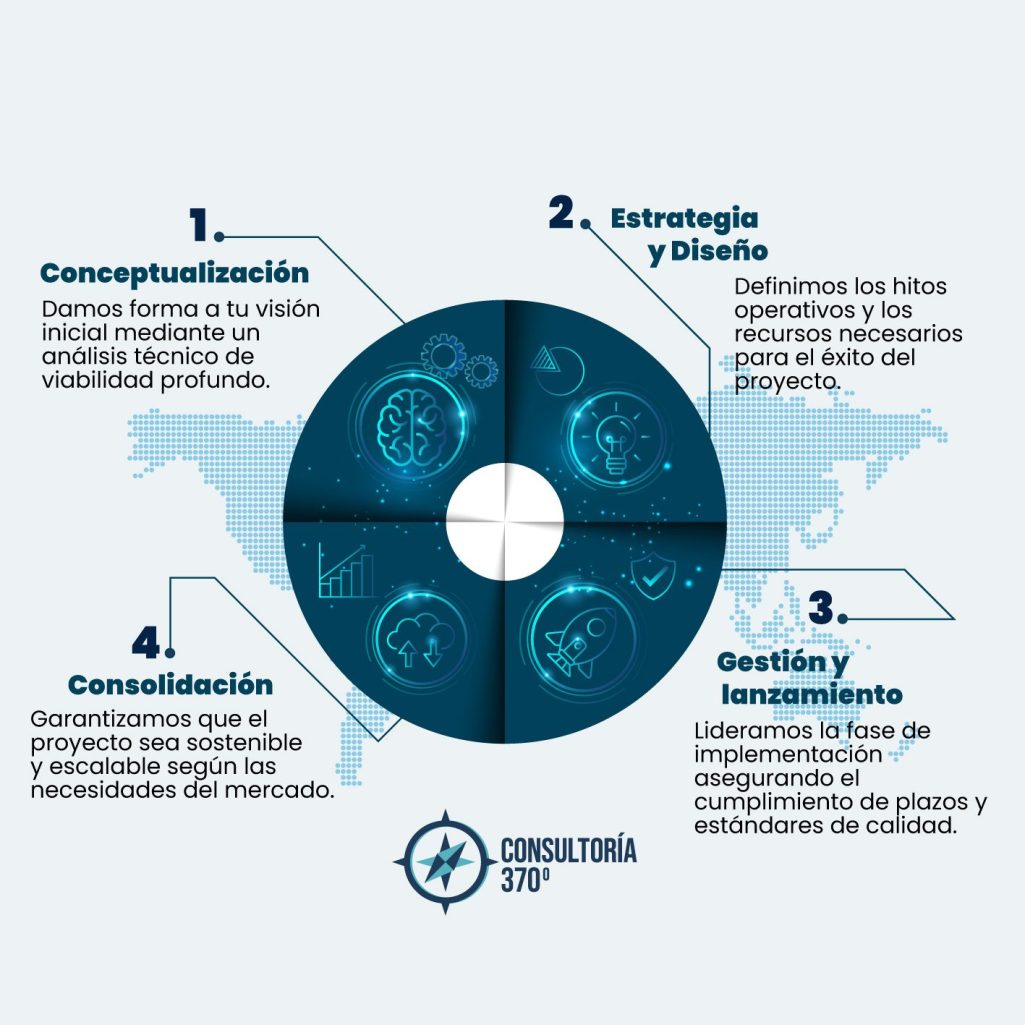 Una vez definida la idea y estructurado el modelo, Consultoría 370° lidera la ejecución completa del proyecto: planificación, desarrollo, puesta en marcha y acompañamiento hasta que el negocio funciona de forma real y sostenible.